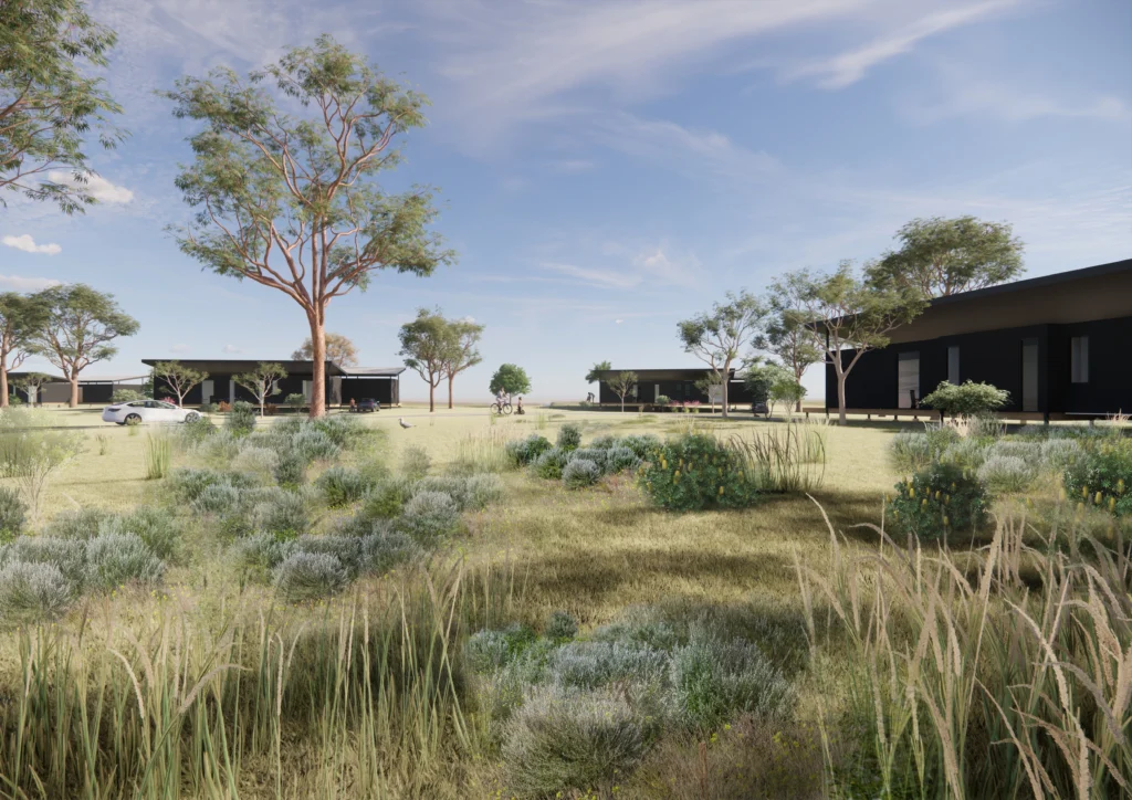 The broader landscape strategy strengthens ecological resilience. Coastal banksia woodland, saltmarsh, estuarine wetland and other native vegetation communities are reinstated, transforming degraded grazing land into functioning habitat. Elevated boardwalks traverse saltmarsh areas, allowing public access without damaging sensitive ecologies. The majority of the 253-hectare site remains permeable, with development concentrated lightly across the landscape.