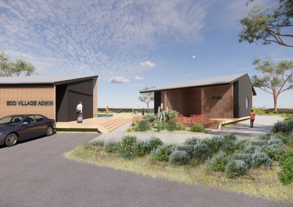 Environmental performance underpins the architectural approach. Buildings are elevated on stump footings, reducing concrete use and allowing water to pass beneath during future inundation events. Finished floor levels are set above projected 2100 storm tide levels, ensuring resilience without excessive intervention in the terrain. Passive cooling is achieved through cross ventilation and deep eaves, while passive solar gain and insulation support winter comfort. All buildings are electric, supported by solar generation, heat pump hot water systems and energy-efficient fittings. Electric vehicle charging and bicycle infrastructure encourage lower-impact transport.