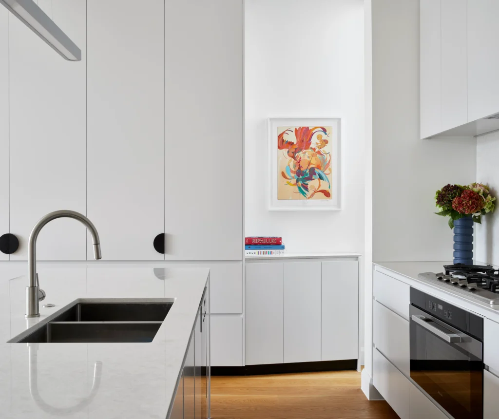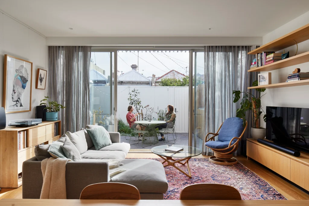 Internally, the project is less about addition than reorganisation. Dark, inefficient rooms have been reworked into a compact but generous ground floor, centred on the kitchen. One of the owners is a professional chef, and the kitchen was always intended to be the social heart of the house. Positioned beside the new stair, it stitches the original rooms to the rear addition, dissolving the usual hierarchy between cooking, dining and living. Large sliding doors open directly to the landscaped courtyard, extending daily life outdoors.