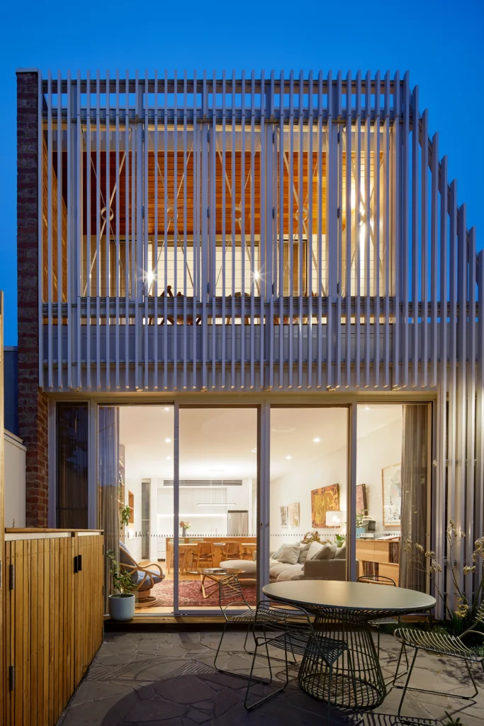 At the upper level, privacy becomes a more visible architectural driver. Operable battens and steel screens temper overlooking and sunlight, particularly to the main bedroom balcony, while still allowing filtered views to the surrounding rooftops and trees.